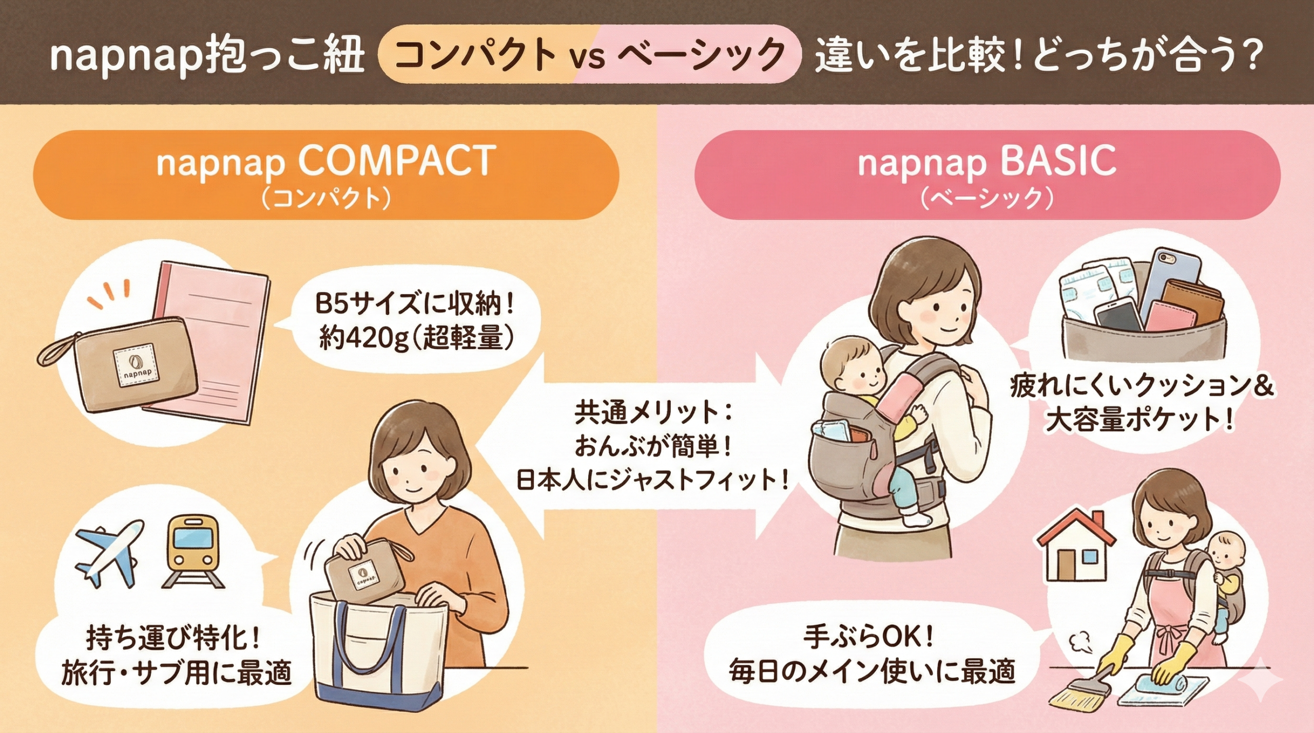 初めてのメイン抱っこ紐としてガッツリ使うなら「ベーシック」、旅行や電車移動、2本目のサブとして選ぶなら「コンパクト」がぴったりですよ。