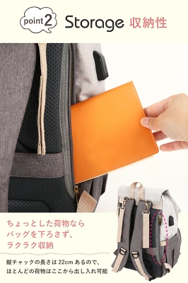 リュックを背負ったままスマホを充電できる「USBポート」が搭載されています。